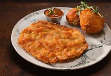 Венский шницель из свинины, фермерский картофель в хрустящей панировке, фирменный красный соус, литр напитка