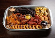 1220 г • колбаски баварские, куриные стрипсы, куриные крылья, луковые кольца, гренки ржаные, сырные пончики, картофель фри, соус спайси, соус барбекю, соус горчичный
