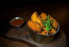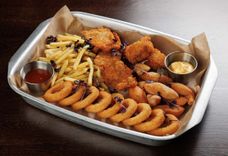 650 г • луковые кольца, куриные стрипсы, сырные пончики, картофель фри, соус сырный, соус кисло-сладкий